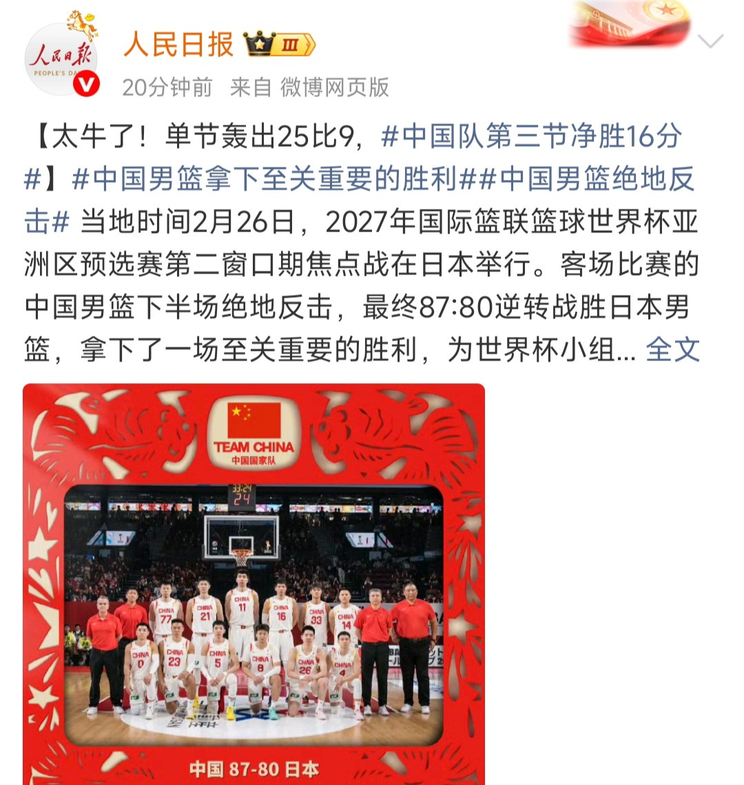 2月26日男篮世预赛,中国男篮客场87:80力克日本男篮,拿到男篮世预赛的首场胜利。本场比赛结束后,三大主流官媒纷纷下场祝贺,而且有关于中国男篮战胜日本男篮的词条,封顶热搜榜第一位。中国男篮一战,引发广大网友热议,这场比赛也算是中国男篮给全国人民拜了个晚年。