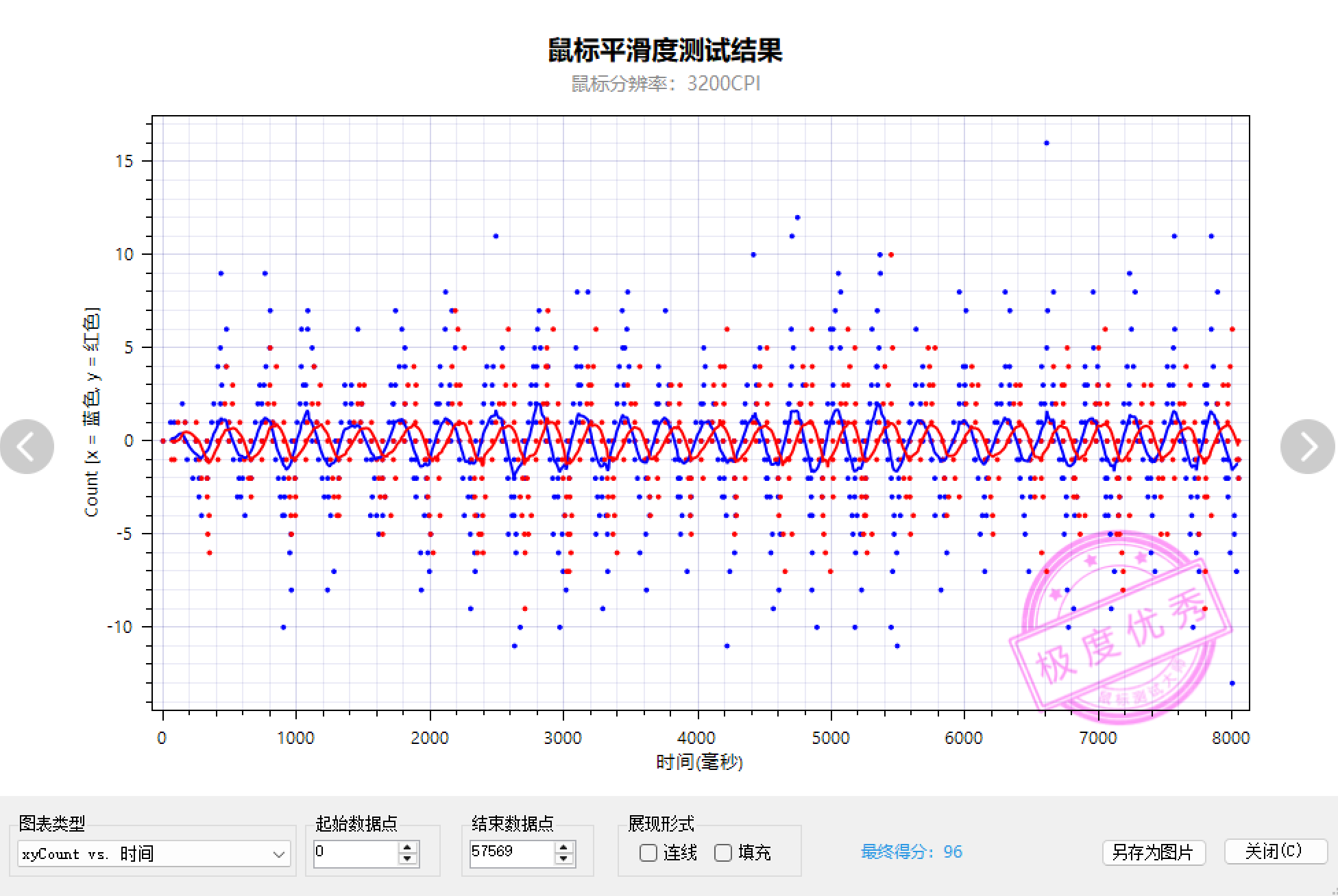 雷柏VT7 MAX在无线连接下,鼠标平滑度测试的数据点分布均匀,波动幅度小,显示出极高的稳定性和精确度,同样属于极度优秀水平。