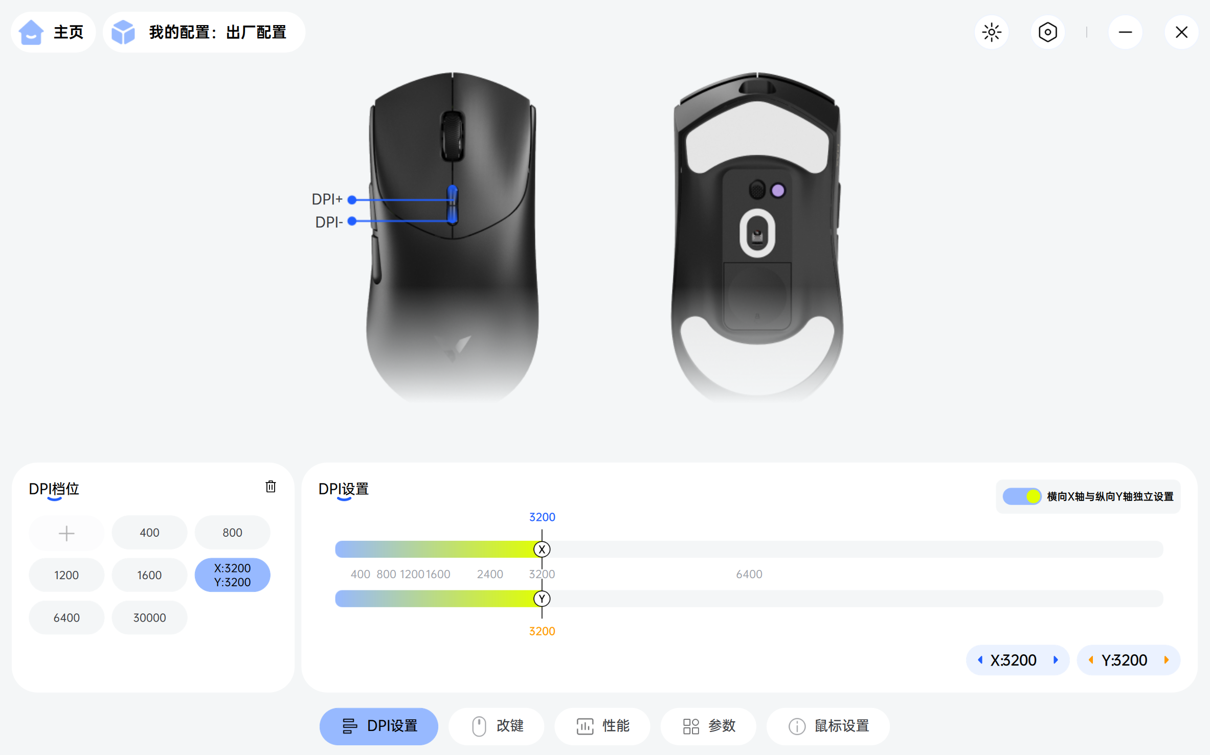 在DPI设置中,雷柏VT7 MAX默认有7档DPI可供选择,用户可根据自身需求进行调整,甚至可以分别设置X轴和Y轴的DPI值。