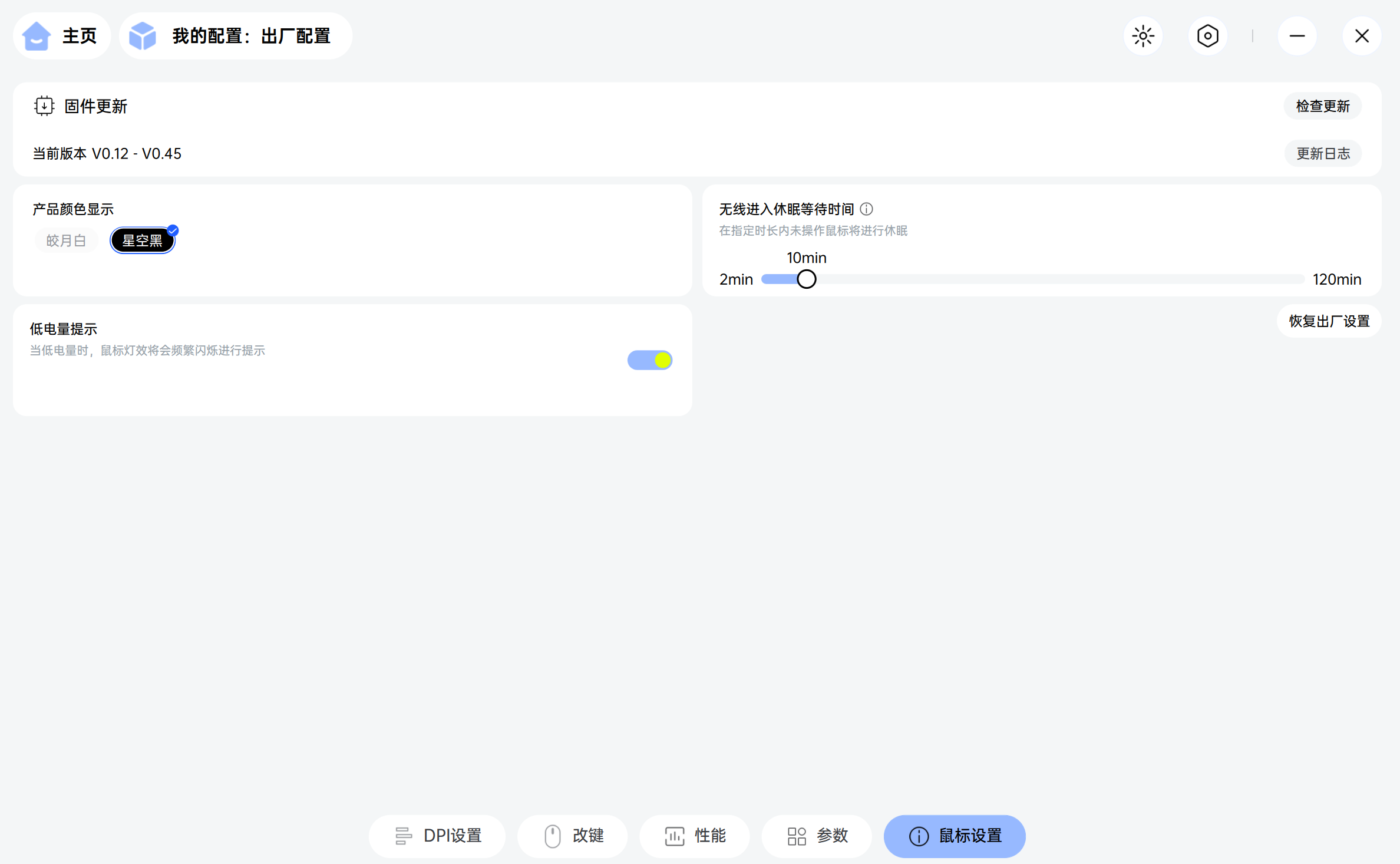 此外,还可以自定义首页展示的产品颜色。无线鼠标的自动休眠时间以及低电量提示信息的开关功能,也都在此页面进行设置。