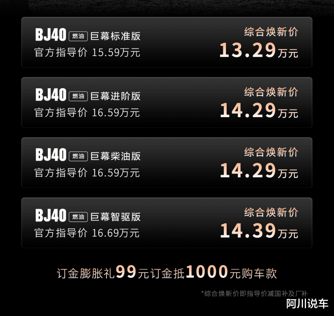 北京越野BJ40燃油巨幕版官方指导价15.59—16.69万元,综合焕新价低至13.29万元。北京越野送上订金膨胀礼:1月27日下订,即可享受“99元订金抵1000元购车款”优惠政策。