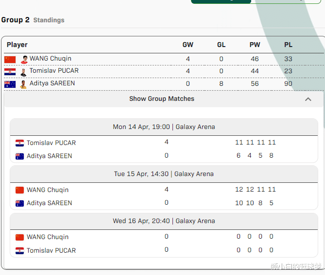 王楚钦第一战是4-0萨琳,托米斯拉夫·普卡也是4-0萨琳,所以这场比赛王楚钦与普卡谁赢谁晋级,如果两人是2-2平就要比小分,球迷们当然希望王楚钦是二连胜晋级。