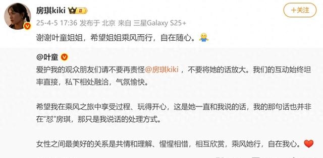 后来叶童在微博上发文解释,说她和房琪私下关系挺好的,房琪一直鼓励她享受节目过程。她还说自己的回应只是说话方式的问题,不是在怼房琪。房琪也转发了叶童的微博,祝福她 “乘风而行,自在随心”。这事儿看起来算是过去了,但网友们的讨论还没结束。