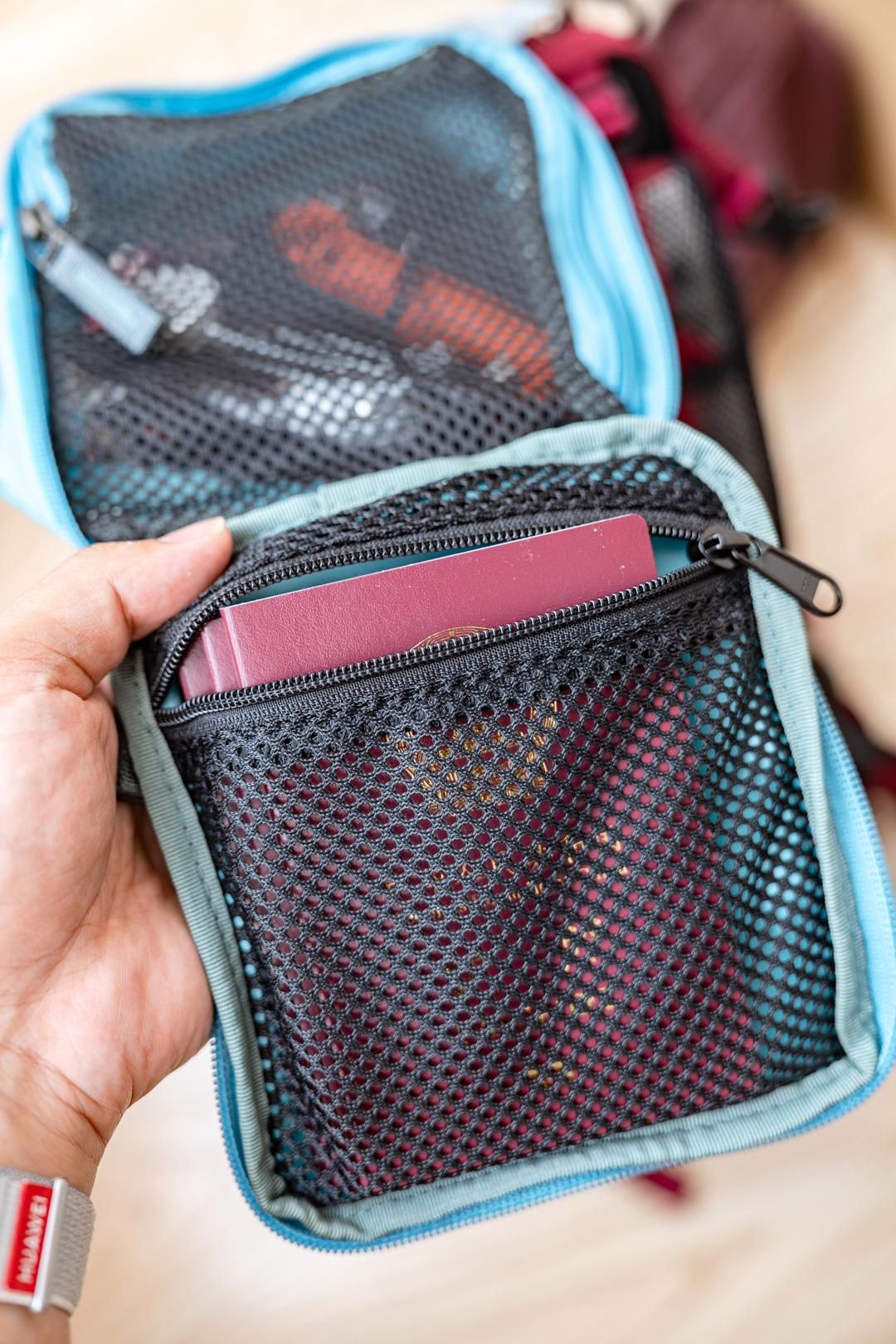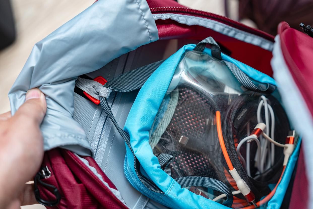 这个包还少一个小物件收纳,我刚好翻出几年前买 shimoda 背包送的一个双面折叠小包,全透明的拉链和网兜,外面有个小提手,经过骇客水袋扣的固定,刚好挂在背包上方。我的护照零钱以及数据线等都分类装进去,彻底解决了小物件收纳的问题。