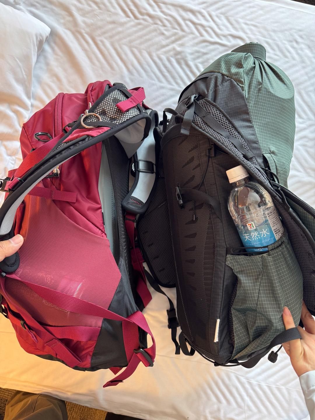这是在日本酒店拍的照片,左边是骇客 26L,右边是迪卡侬 MH500 22L 双肩包,全塞满的情况下,察觉还是很明显的。
