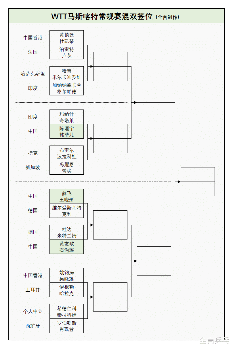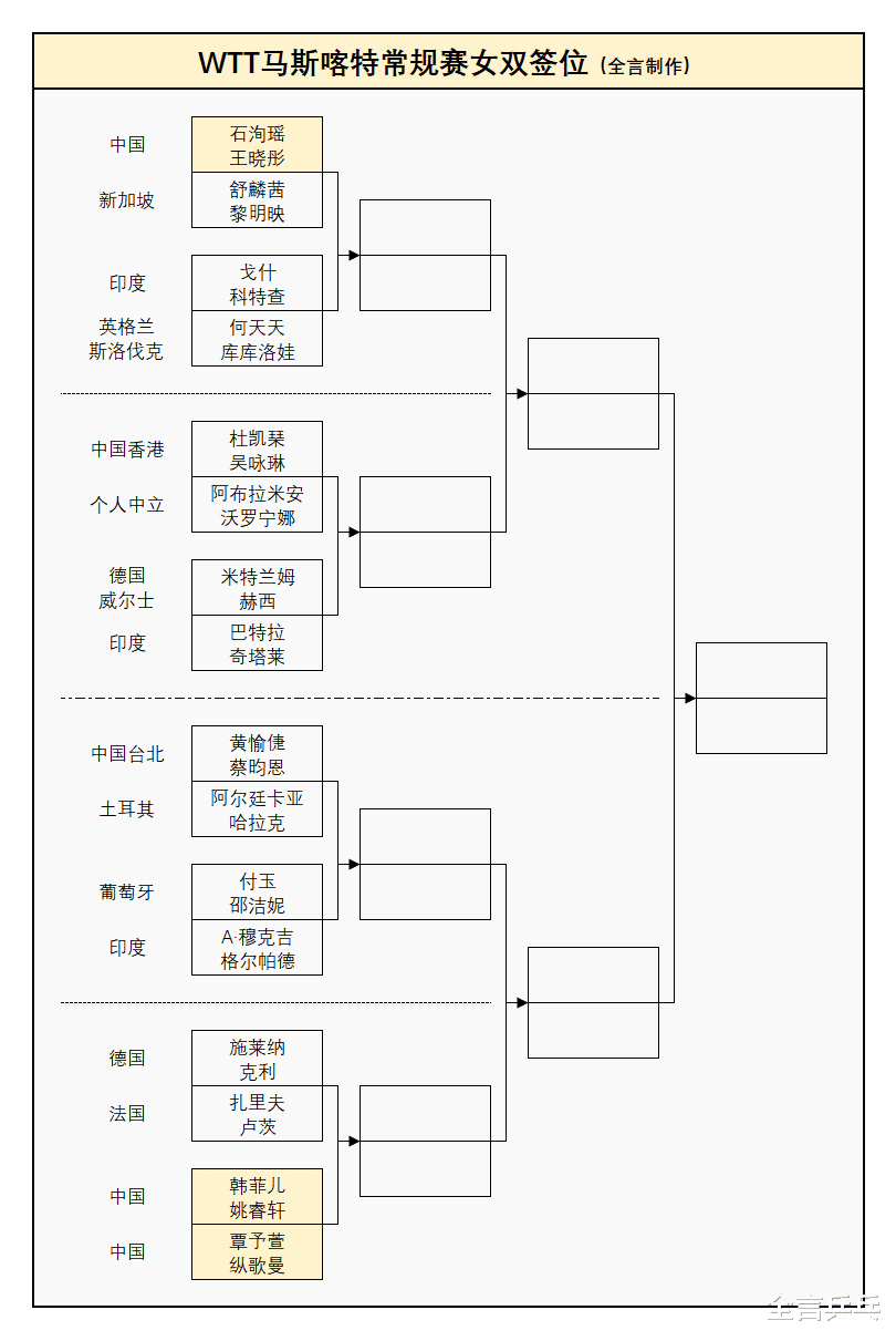 国乒双打资格赛3对组合参加,结果混双袁励岑/何卓佳、男双袁励岑/陈垣宇分别输法国的泊雷特/卢茨、伊朗的阿拉米扬/沙姆斯,只有女双韩菲儿/姚睿轩过关,结果她俩正赛首轮也打内战,与队友覃予萱/纵歌曼过招,不过总的来说中国队在这个项目上的优势还是比较大的。