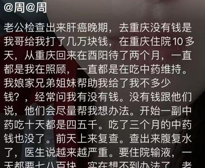 经了解,小周的丈夫大江为重庆籍人士,于今年五月被诊断罹患晚期肝癌,其腹腔内积聚了大量液体。至九月,大江的癌细胞已扩散至淋巴结等区域,病情迅速恶化。