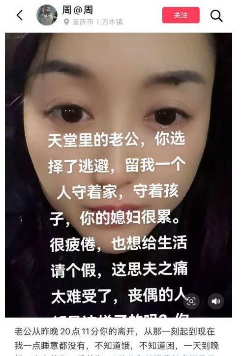 小周在其影像上题述:“天国中的爱侣,你挑选了遁逃,使我独自承担家庭与子女的重任,我的伴侣身心俱疲,渴望为生活放个小假,思念之情令人心碎,失偶之人是否皆是如此?”你们是如何走出困境的。无