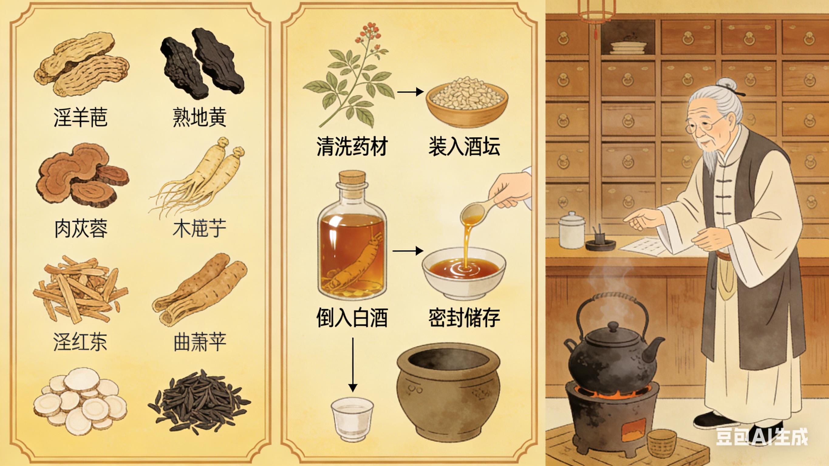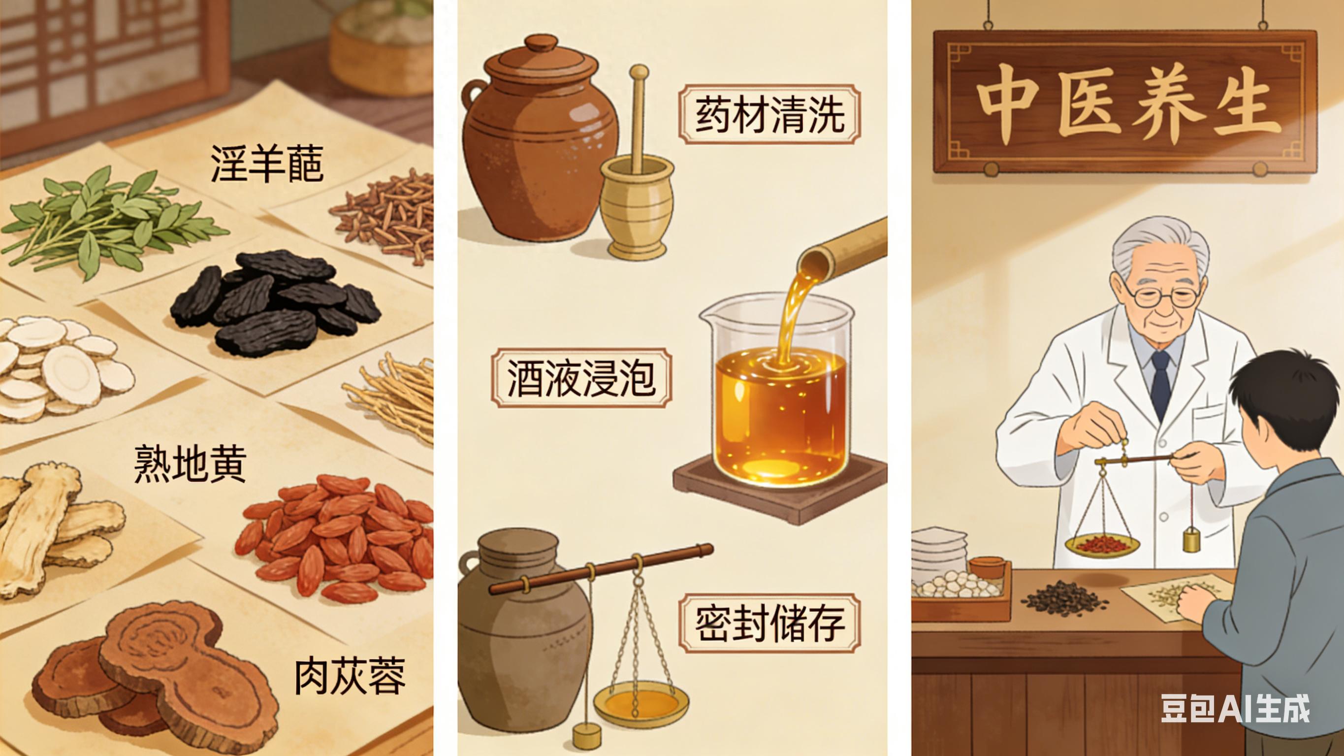 在快节奏的现代生活中,熬夜加班、久坐不动、饮食不规律等问题,让越来越多的人出现肾阳虚、腰膝酸软、神倦体乏等健康困扰。中医讲究“药食同源”,药酒作为传统养生文化的瑰宝,既能借助酒的渗透力促进药效吸收,又能通过药材的配伍调理身体机能。今天,我们为大家揭秘一款传承已久的“回春酒”配方——它以滋阴补阳、固本培元为核心,针对肾阳虚弱、阳痿不举、腰膝酸软等症状有显著调理作用,堪称老中医的“私藏秘方”。