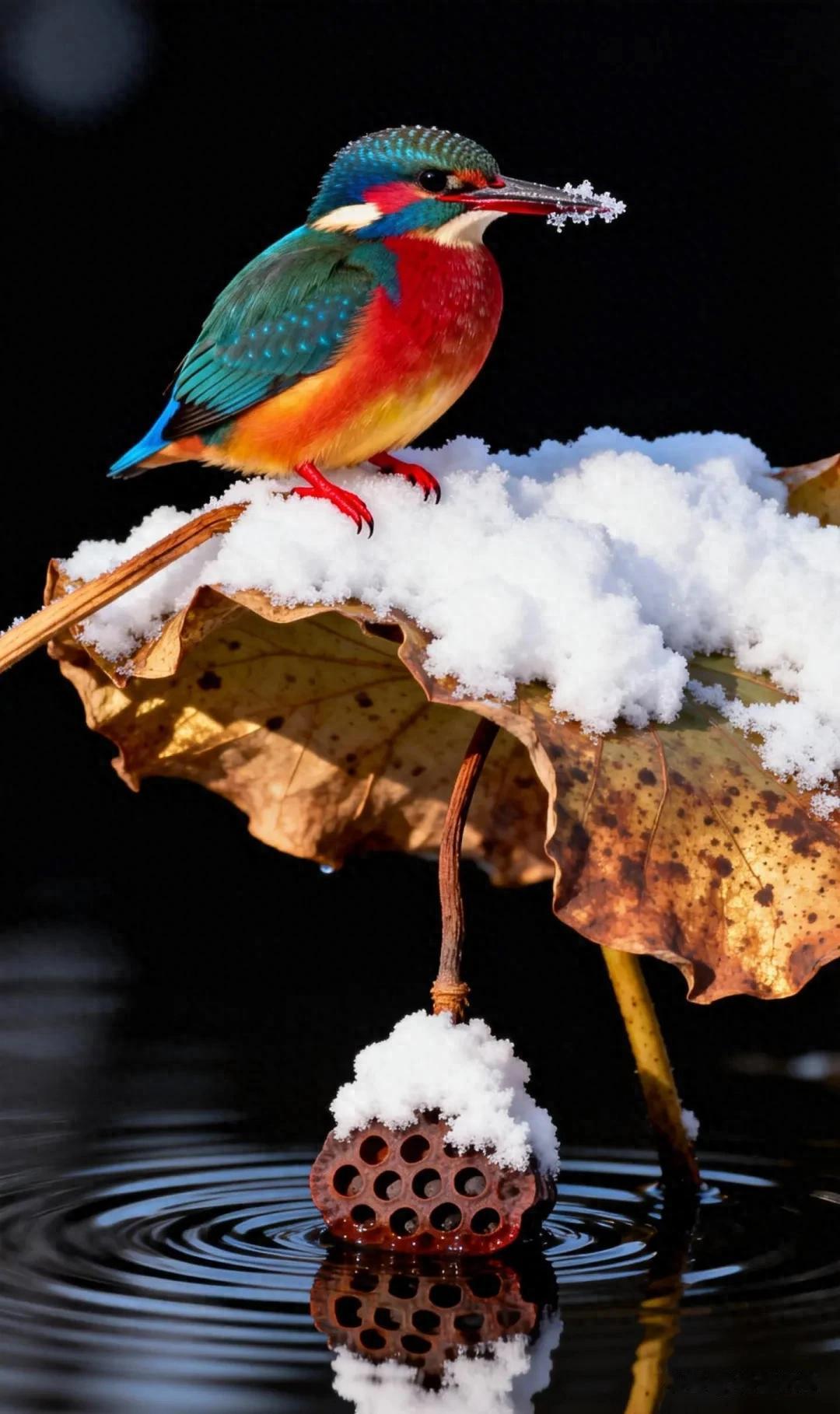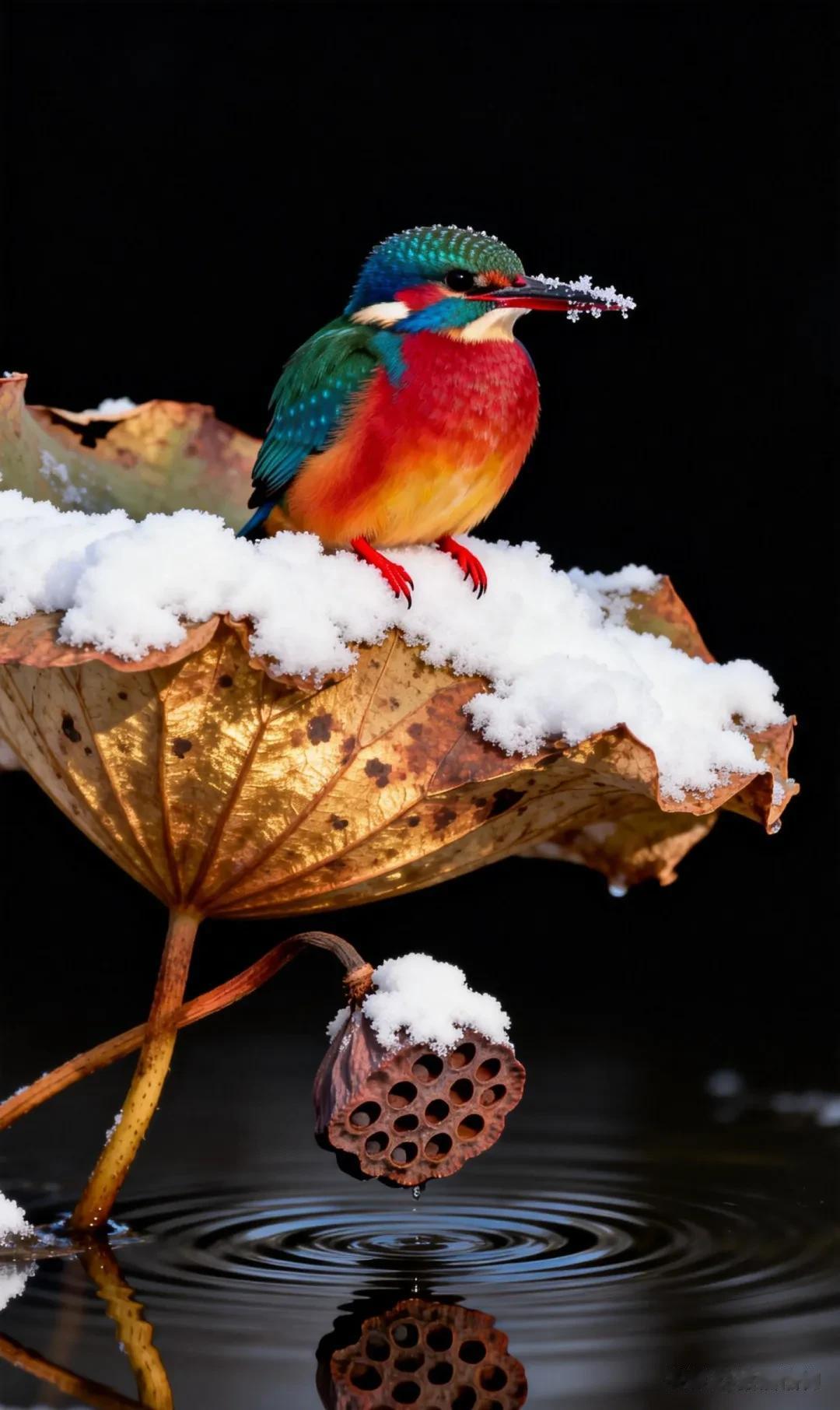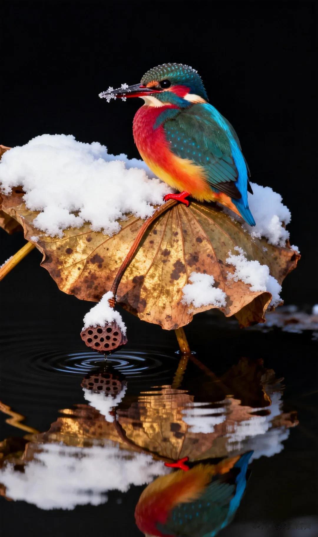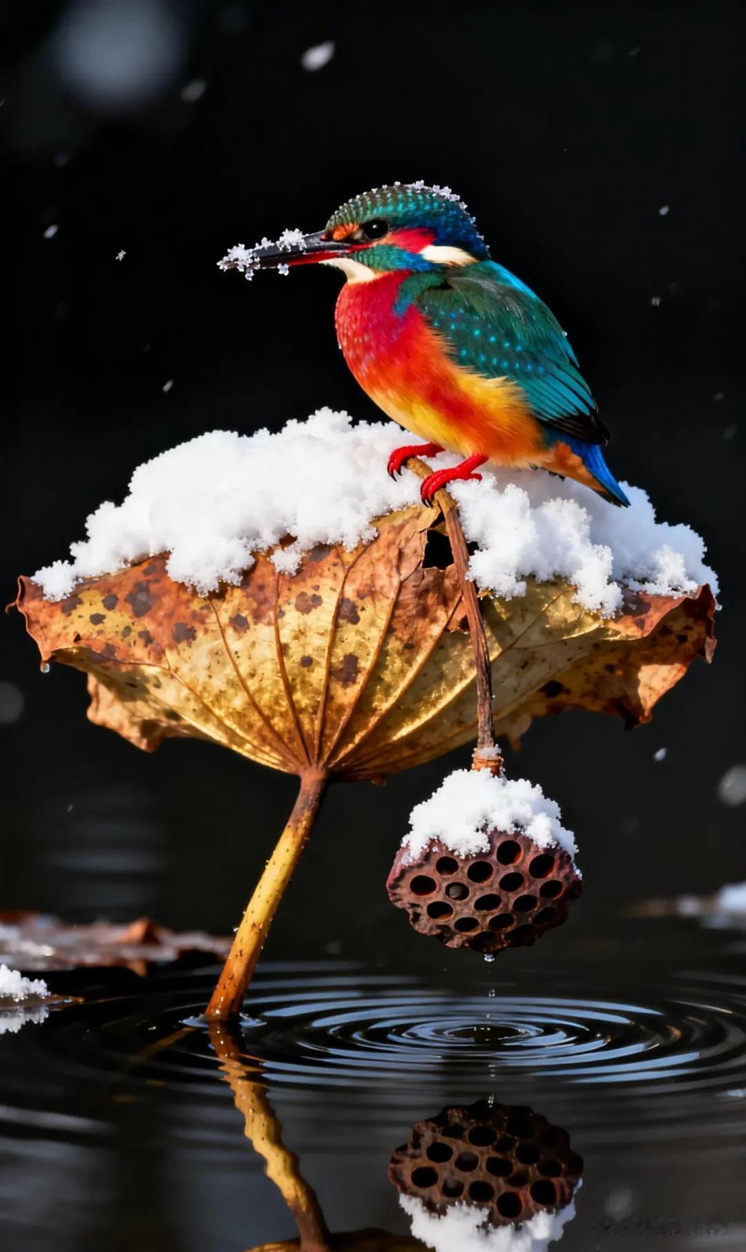 翠鸟立于荷面,羽毛积着薄雪,喙尖一点白。