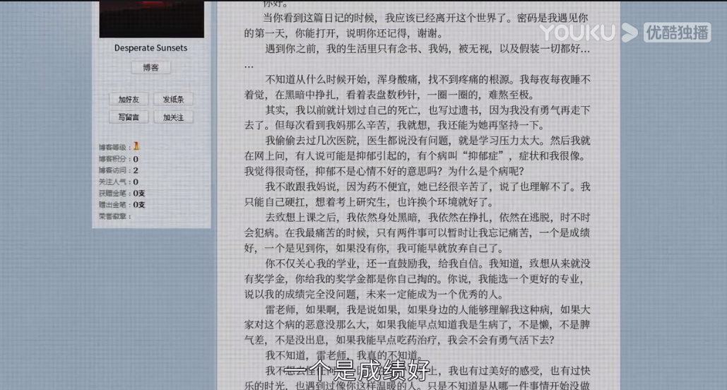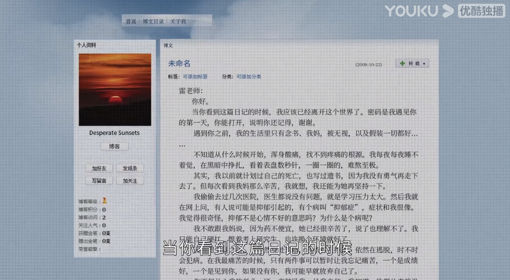 而当李燃发现郑倩的博客密码时,遗书的曝光将整个剧情推向了高潮。郑倩在遗书中详细记录了自己的痛苦经历,包括身体的酸痛、对死亡的计划以及对雷鸣的复杂情感。这份遗书不仅让人们对郑倩的死因有了更深入的了解,也让人们开始关注到抑郁症这一社会问题。