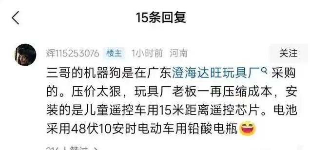 这不,就上面那个机器狗,就有广东网友爆出,是中国一个玩具厂造的,而且还玩命压价,老板没办法,只能把芯片换成遥控汽车级别的电池,换成了电瓶车同款电池——铅酸48伏10安的电池。
