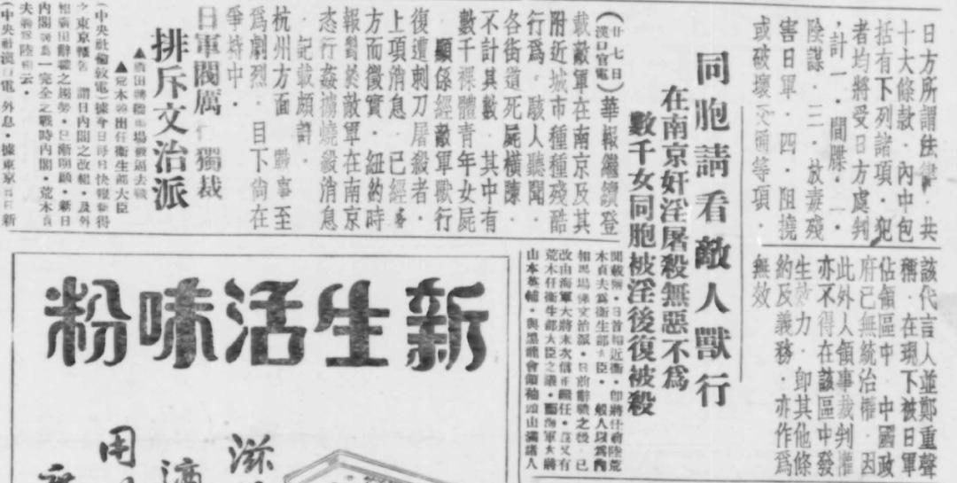 1937年12月28日,新加坡《总汇新报》在第4版刊登《同胞请看敌人兽性 在南京奸淫屠杀无恶不为 数千女同胞被淫后再被杀》,文中除描述日军恶行外,还提到“纽约时报对于敌军在南京恣行奸掠烧杀消息记载颇详”,从侧面印证了日军暴行的真实性。