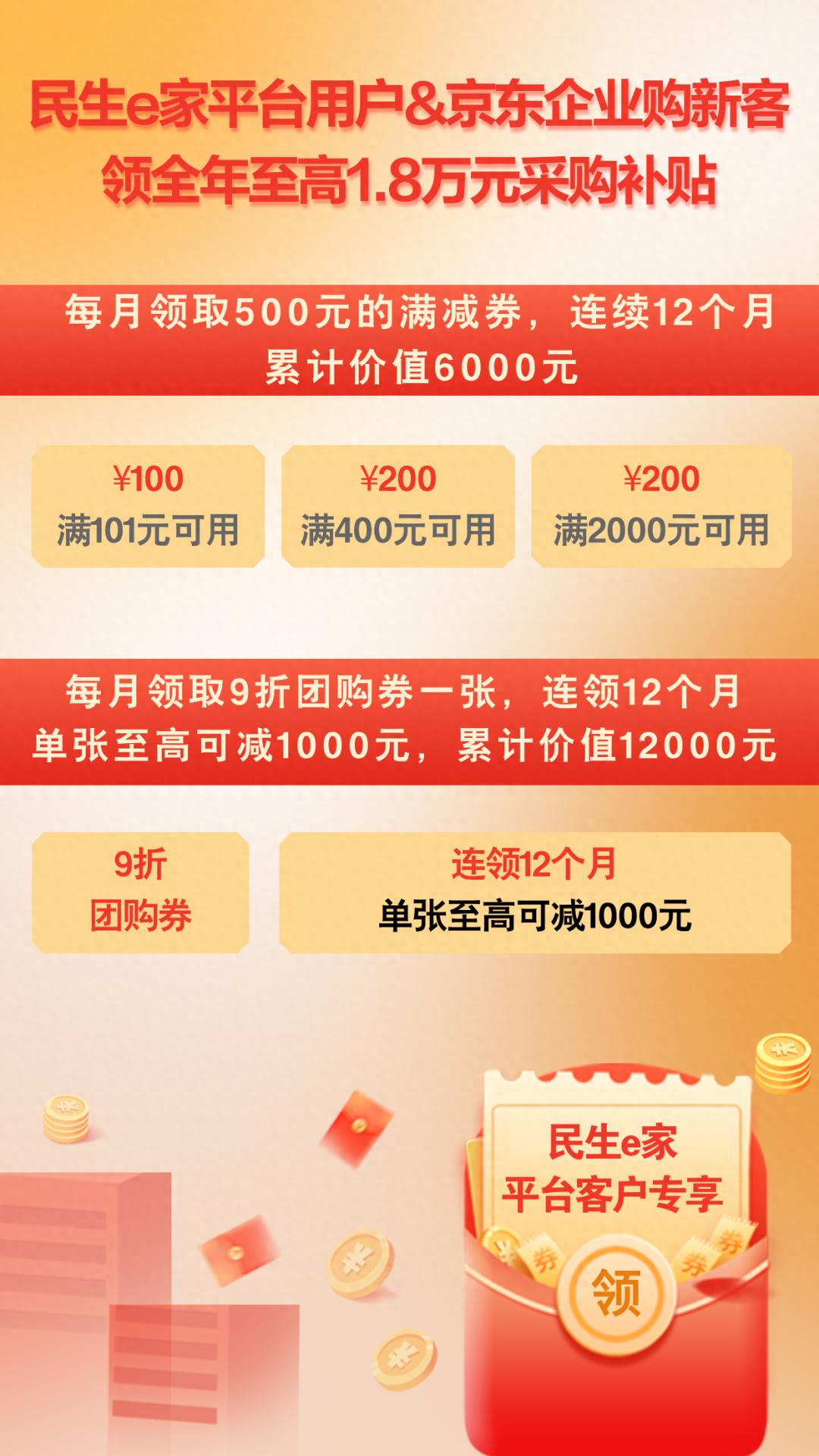 民生e家平台企业用户,首次注册京东企业购,享全年至高1.8万元专属采购补贴。