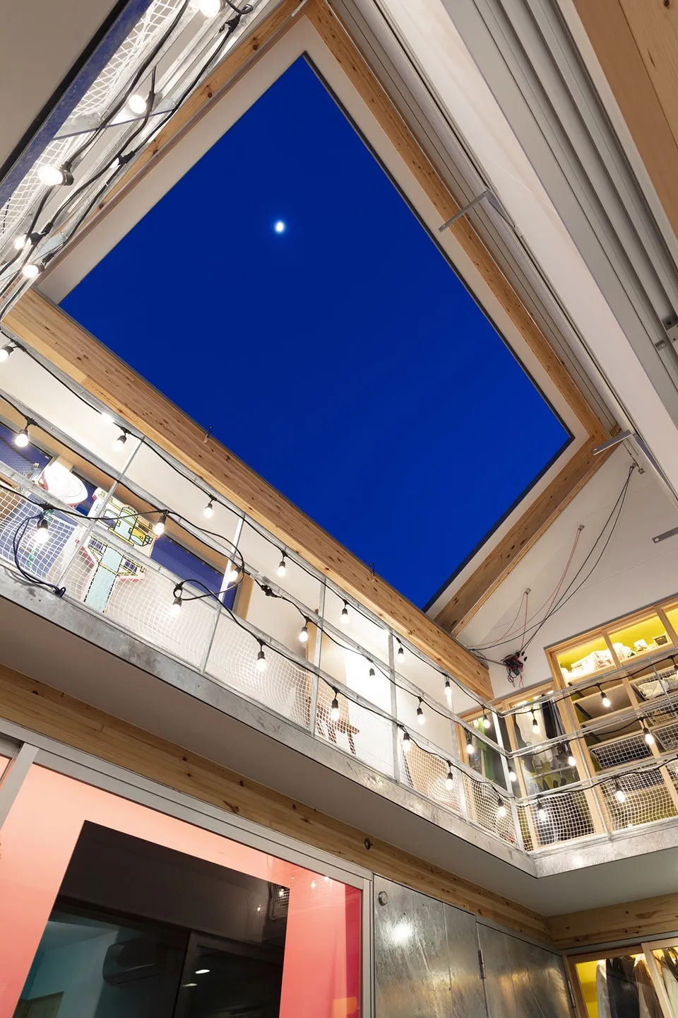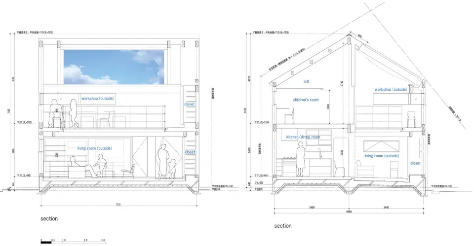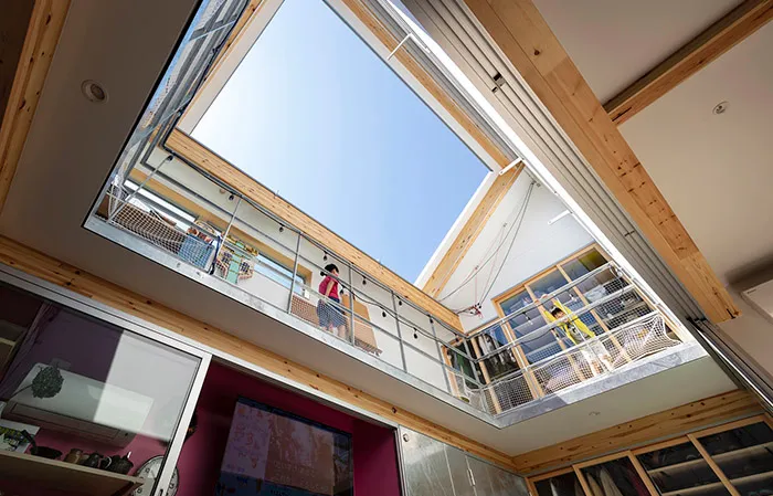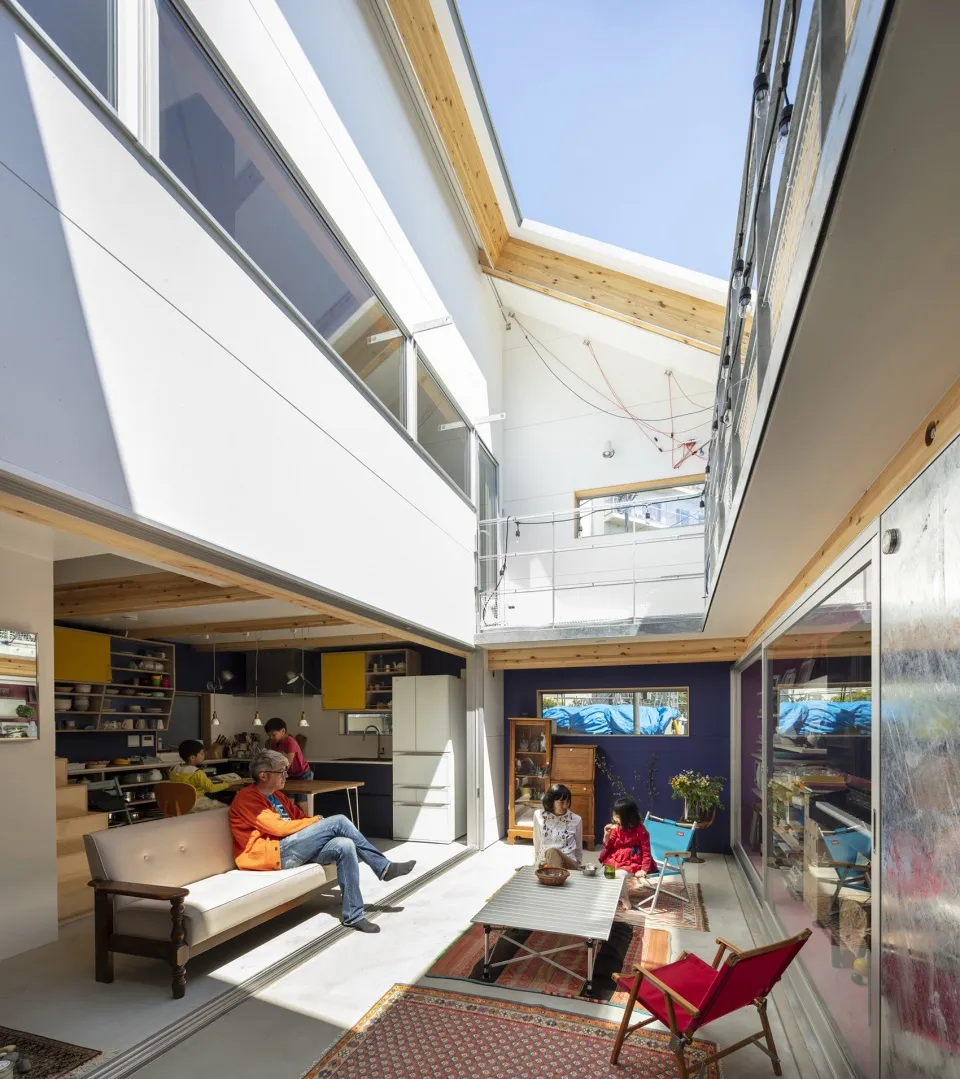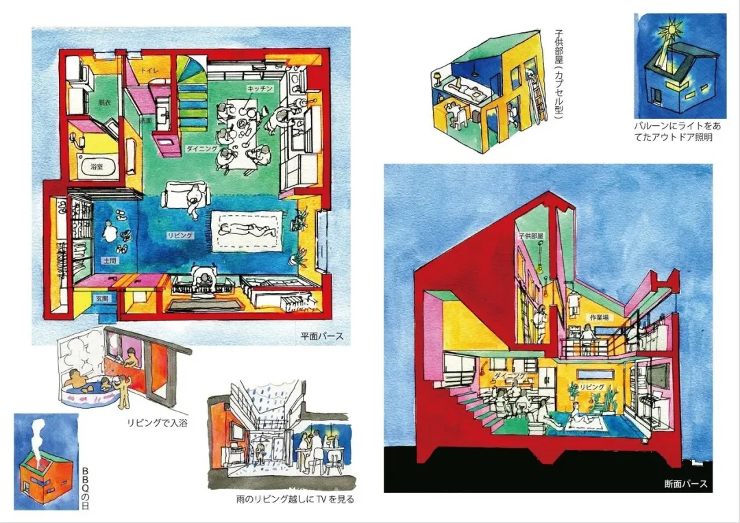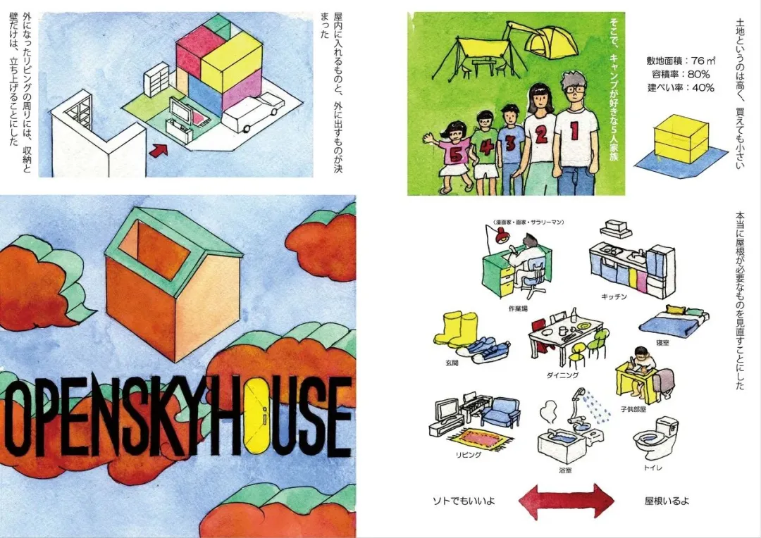 业主高桥先生与太太,好不容易在地价昂贵的东京购置了这一小块土地,但由于日本相关法规,整块地只有38平米的空间可以建房,换算起来这一家五口根本没法住。好在这家里有个“斜杠老爸”,高桥先生是个极具创造力的人,他曾组过乐队、办过电台、还出版过漫画,脑子里充满着无数想法,面对这一挑战,他提出了一个大胆的构想:“让我们打开屋顶吧!”。