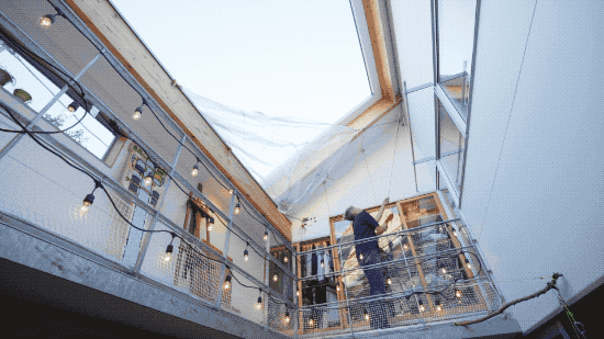 最引人注目的便是这座房子的核心亮点:一个无屋顶的客厅,这个约15平米的空间,为了确保该区域不计入建筑面积内,设计中避免使用任何固定的遮盖物如天窗。但是,通过使用可移动的遮雨布,类似于帐篷的布料和帆船的绳索结合,创造出一个可根据天气变化调整的遮雨设施,此外,客厅的墙面使用的是外墙防水涂料,排水系统也经过精心设计,确保即便在无屋顶的情况下也能防水防潮。