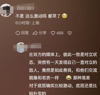 关于美国网民的眼泪和感叹,一些中国网民分析认为,在两国的媒体环境中,经常会出现相互对立的情况。但是,当人们突然意识到自己一直认为是“对立面”的人竟然如此善良和友好,就像老朋友一样亲近时,那种失落的感觉确实会让人感到非常激动。尤其是对于社会底层的人们,这种简朴而真挚的情感显得更为深刻和感人。