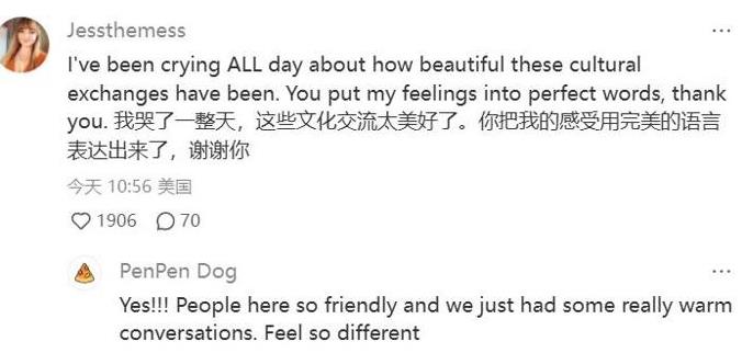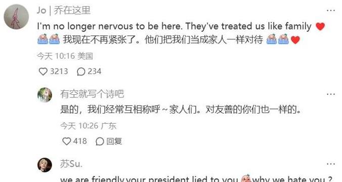 还有一些美国的网友表示,现在在小红书上用中文与中国人交流,感觉完全不紧张了,因为中国人总是把他们当作家人一样对待。