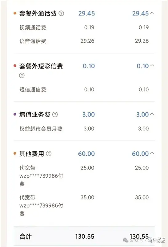 在登录中国移动APP查询后陈女士发现,移动号码套餐的月租确实是38元,但加上套餐外的通话、增值服务及一些其他费用,每个月的话费几乎都在120元以上。而最让陈女士不解的是,母亲的号码下关联了两条宽带,一个月的费用分别是25元和35元。