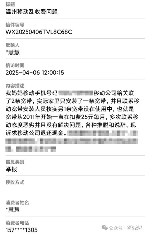 同样遇到移动宽带问题的还有张女士。张女士说,2021年10月7日,她在苍南县灵溪镇塘北东路移动营业厅为公公办理宽带注销业务,并同步申请将自己手机号关联的宽带迁移至同一地址。当时移动工作人员当场确认“已办理完毕”,但至今公公的手机号仍持续被扣取宽带费用。