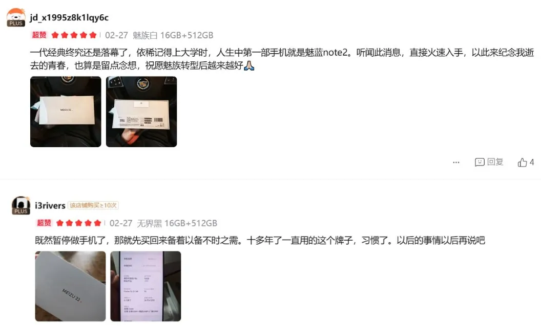 有手机店主直言,平时魅族机型销量平平,转型消息出来后,一天卖了10多台魅族22,全是老粉回头客。京东自营店里,评价区更是看哭人,有老用户说“买的不是手机,是青春念想”,还有人感慨“从M8用到魅族22,也算给我的青春画个句号”。