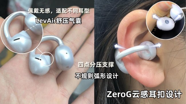 这款耳机的佩戴感真的没话说,算是耳夹式耳机的天花板了。它的固定单元用了LevAir零压气囊,能跟着佩戴压力随时变形,缓冲重量,而且单耳才4.8g,戴一整天耳朵也不会有压痕、不疼。耳夹是ZeroG云感设计,不对称弧形能形成四点分压,重量分布很均匀,戴得特别稳,跑步、剧烈甩头也不会掉。连接桥用的是航空钛合金骨架加高分子记忆材料,能随便弯折,实测弯折10000多次还没坏,耐用性拉满,舒适、稳固又耐用,三者都做到了。