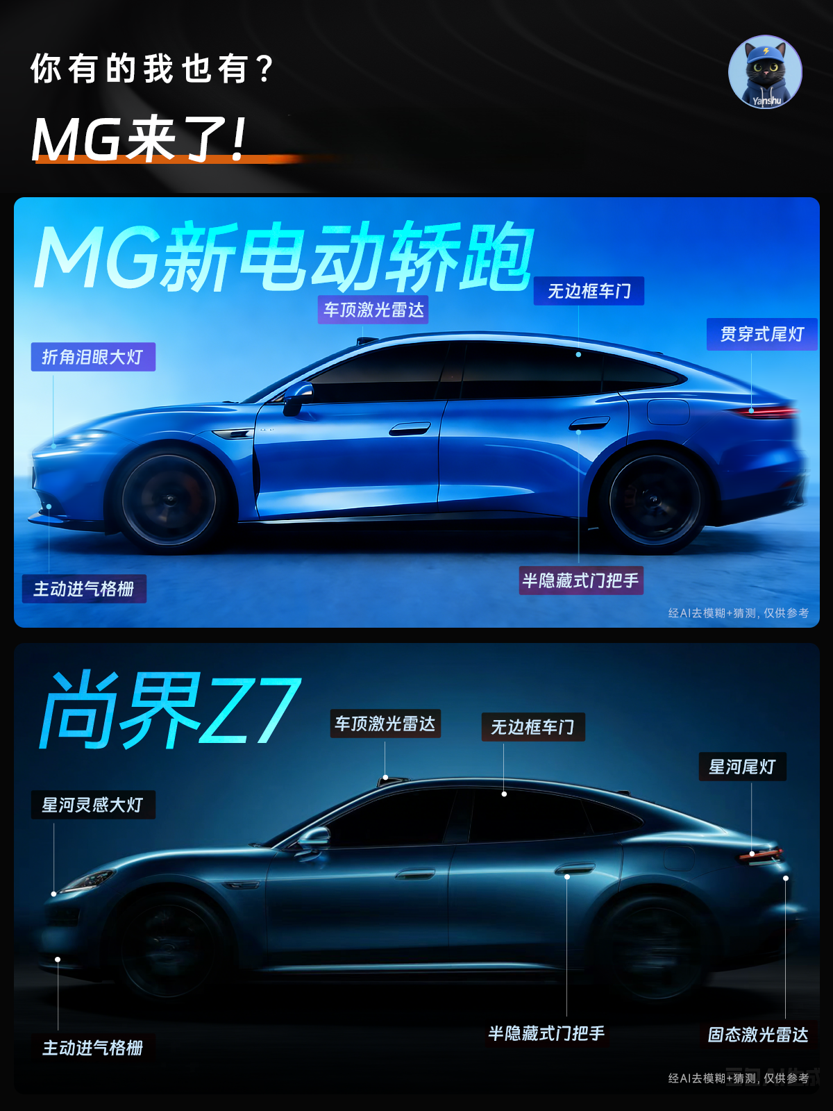 看了刚流出的MG电动轿跑谍照,这车和尚界Z7长得是真的像,感觉像是同一个设计团队的手笔。从目前能看到的来看,两车共享的核心配置确实不少:无框车门、隐藏式门把手、车顶激光雷达这些都有,造型也都是溜背轿跑路线。不过仔细看细节,我觉得MG的前脸似乎更接近初代Taycan的经典风格,尾灯造型也更收敛些。据一些消息说,MG可能还会多给个双层镀银玻璃,智驾方案说不定也会用不一样的供应商。最关键的是价格——尚界Z7听说要25万左右起步,但以MG一贯的做法,我估计这台新车很可能会定在15-18万这个区间。要是真能这样,同样的轿跑造型、相近的配置水平,价差能有好几万的话,那MG这台车确实挺有看头的。不过现在这些都还是猜测,最终怎么样,还得等官方消息。不急着用车的朋友,我觉得可以两边都再观望看看。