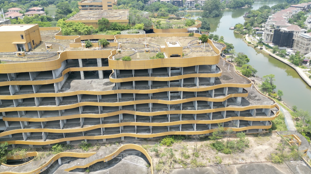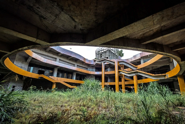 如今你经过,会看见金色外皮早已斑驳脱落,露出里面灰沉沉的水泥。楼层之间空无一物,没有门,也没有灯。杂草从露台一直蔓延到屋顶,在风里轻轻摇晃,像是这座建筑自己长出了荒芜的头发。