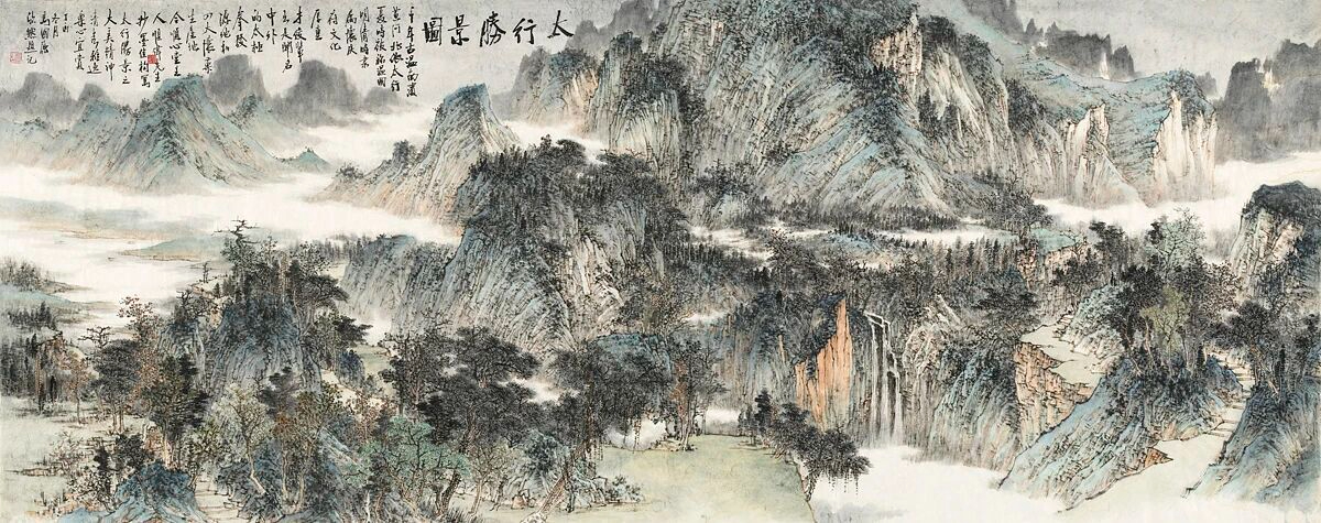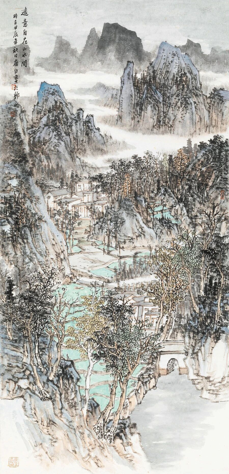 你看他笔下的青绿峰峦,是揉碎的翡翠浸了晨雾,皴笔的纹理是风在崖壁刻下的诗行;松枝的浓墨是夜凝的云,梢头的淡翠是春吻过的痕,连藏在林麓间的村落,都似把烟火裹进了山的褶皱里。《夏山遇雨》的翠色,是把湖光泼向了峰峦,水纹的淡墨是揉碎的玉,石桥的线条是时光搭起的弦,一触便淌出溪声。这哪里是画,是把 “山水含情,村落藏暖” 的意趣,熬成了墨色里的呼吸:每一笔皴擦都是山的低语,每一层晕染都是云的轻吟,恰似蚕织锦缎,把灵韵织进了宣纸的经纬。
