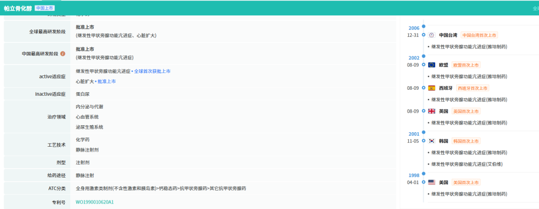 帕立骨化醇是Abbvie公司开发的活性维生素D类似物,用于治疗接受血液透析的慢性肾功能衰竭患者的继发性甲状旁腺功能亢进。帕立骨化醇主要有注射液和胶囊剂两种剂型,其中帕立骨化醇注射液最早于1998年4月17日获得FDA批准。