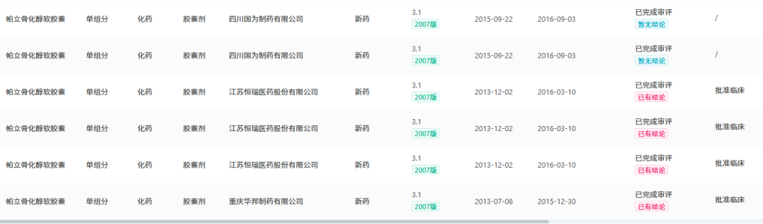 目前国内暂无帕立骨化醇软胶囊获批生产。雅培早在2005年向CFDA提交了3项帕立骨化醇胶囊的进口临床申请,截止目前仍处于获批临床状态。国内除恒瑞外,还有四川国为制药、重庆华邦制药两家药企按3.1类提交临床申请,目前仍处于获批临床状态。