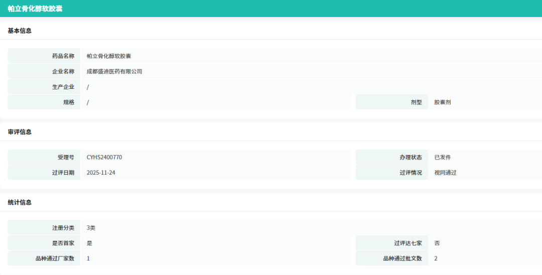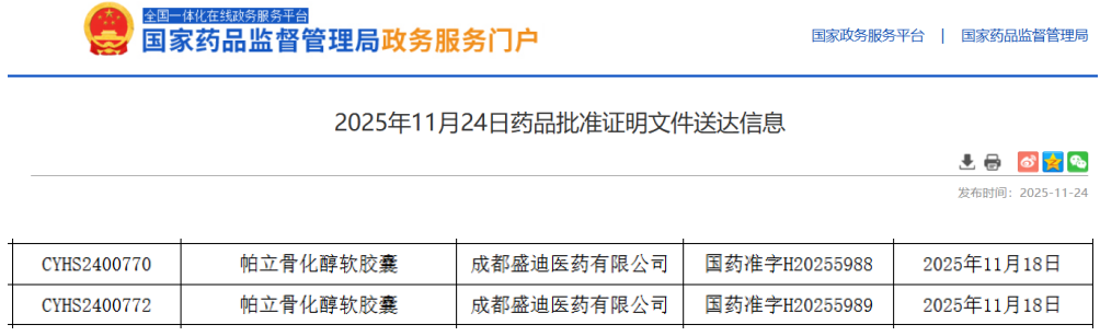 11月24日,据NMPA官网显示,恒瑞子公司成都盛迪医药申报的3类仿制药帕立骨化醇软胶囊获批上市并视同过评。截止目前,该品种在国内暂无药企获批上市。