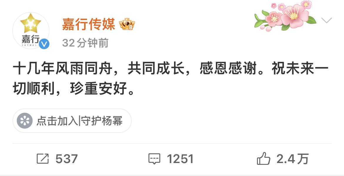 随后,嘉行传媒也发文:“十几年风雨同舟,共同成长,感恩感谢。祝未来一切顺利,珍重安好。”