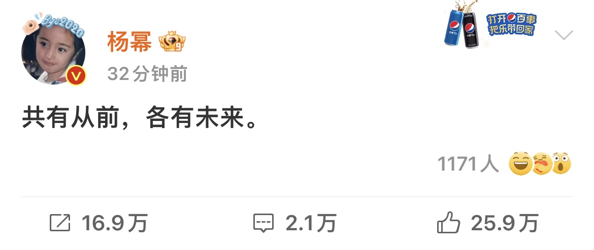 5月8日,杨幂本人发文官宣与嘉行结束合作关系,“共有从前,各有未来。” 并更换微博头像,表示新的开始,杨幂工作室也转发称一起奔跑。