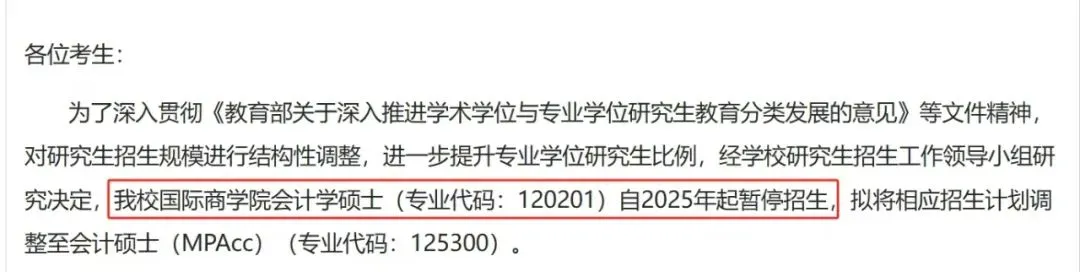 对外经济贸易大学:国际商学院会计学硕士(专业代码:120201),自2025年起暂停招生。