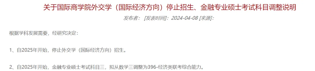 北京外国语大学:自2025年开始,停止外交学(国际经济方向)招生,并且金融专业硕士考试科目三,拟从数学三调整为396经济类联考综合能力。
