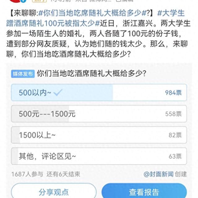 事情在网络上发酵之后产生了两种完全不一样的声音这件事情在网络上发酵之后,有许多的网友指责,这两个女大学生,认为两个女大学生随礼一百元钱,真的太少了。