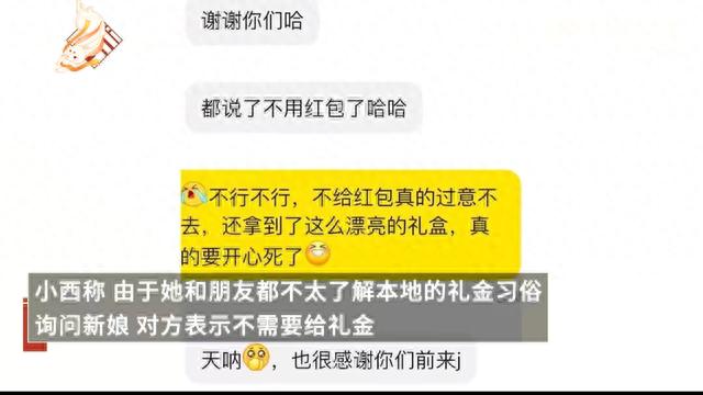 在现场,两位女大学生给新娘子红包的时候,新娘子还表示不用给红包。