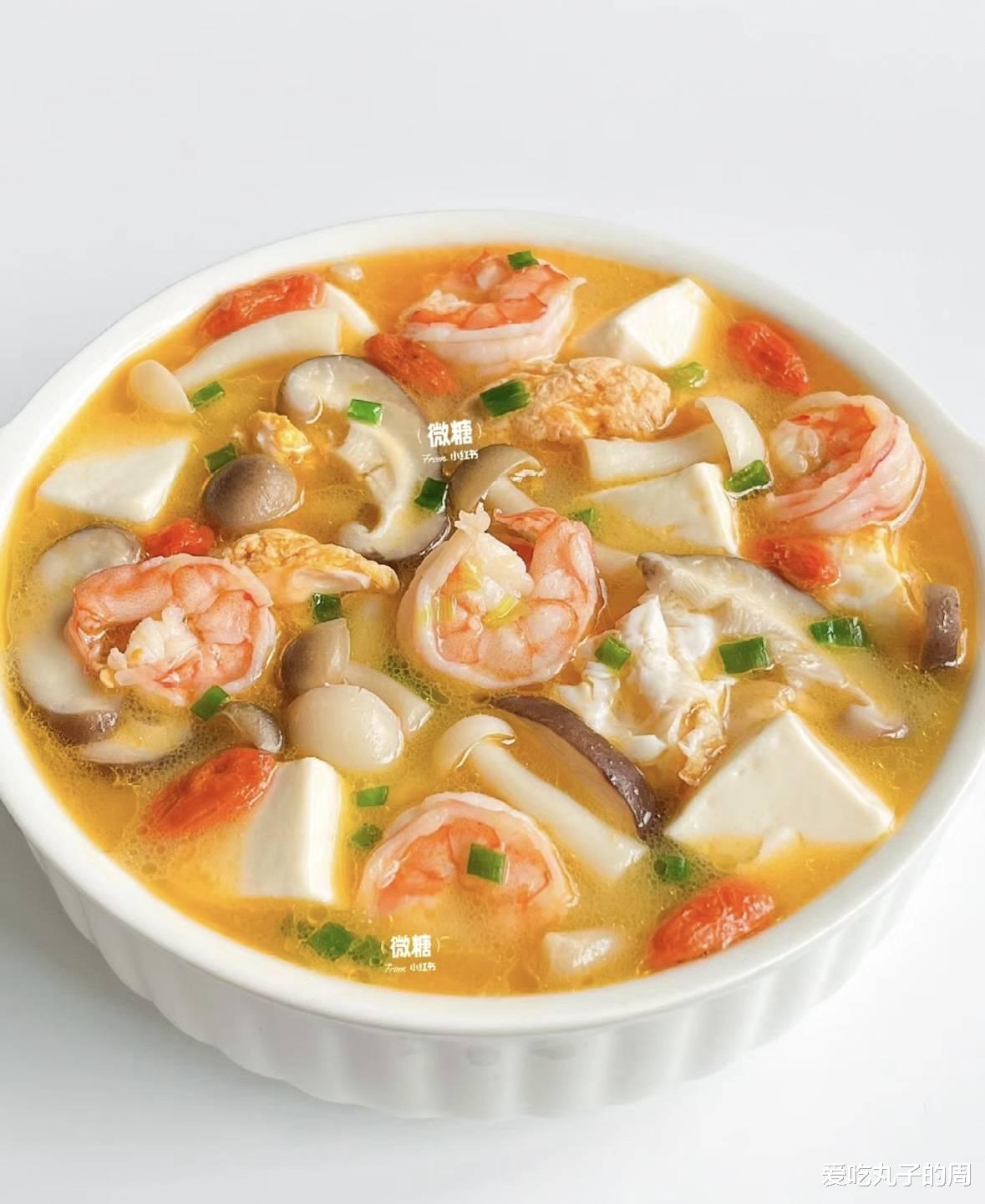 2. 烹调过程焯水:锅中烧开水,加入少量料酒和姜片,分别将虾仁、鱿鱼圈快速焯水后捞出备用;如果使用的是贝类,则在水中煮至开口即可取出。炒香:锅中倒入少许油,放入葱姜爆香。煮汤:加入适量清水或高汤,大火煮开后转小火慢炖10分钟左右,让汤底更加浓郁。