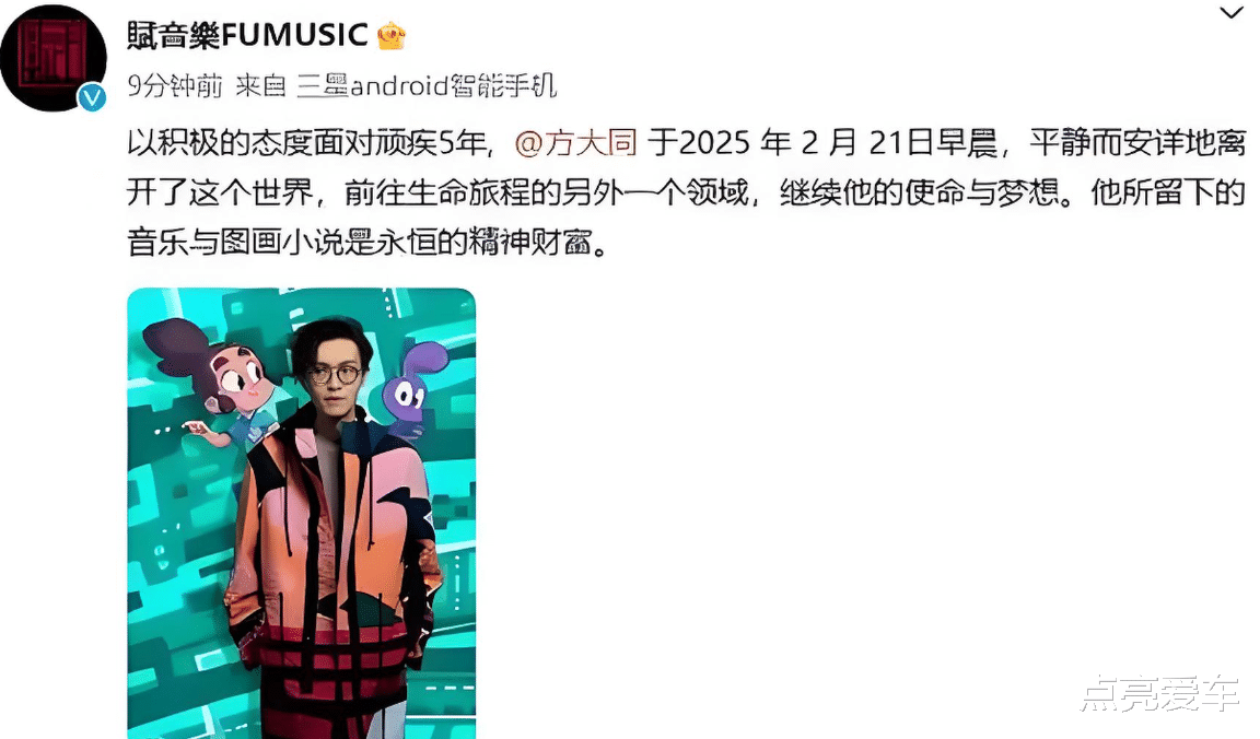 2025年3月1日,娱乐圈传来噩耗,知名歌手方大同因病去世,年仅41岁。这一消息让无数歌迷和业内人士感到震惊与惋惜。方大同所属公司发布声明称,他于2月21日早晨平静离世,结束了与病魔长达五年的抗争。