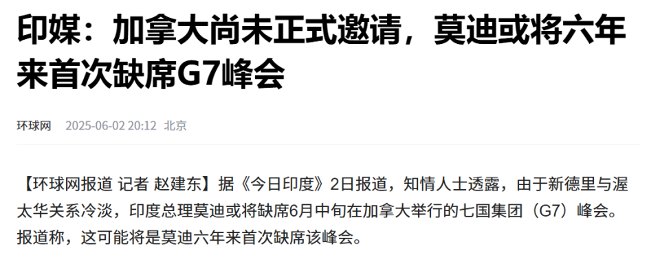 最近,国际政坛爆出一则大新闻!据《今日印度》6 月 2 日报道,知情人士透露,印度总理莫迪很可能缺席 6 月中旬在加拿大举行的七国集团(G7)峰会。要是真这样,这可是莫迪六年来第一次缺席 G7 峰会,消息一出,立刻引发全球热议,大家都在琢磨:印度这是咋了?背后到底藏着什么门道?