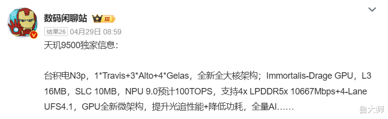 至于这么早被爆料原因,鲁Sir瞎猜应该与最近台积电第三代3nm(N3P)制程工艺落地有关,而天玑9500与第二代骁龙8至尊版都将采用N3P工艺,当然苹果A19大概率也是。