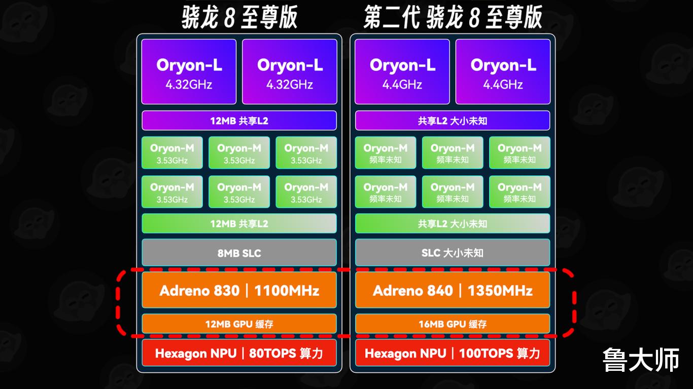 二代骁龙8至尊版GPU部分,将从上代Adreno 830升级至Adreno 840,频率从上代1.1GHz上涨到1.35GHz,配给GPU的独立缓存也从12MB升至16MB。