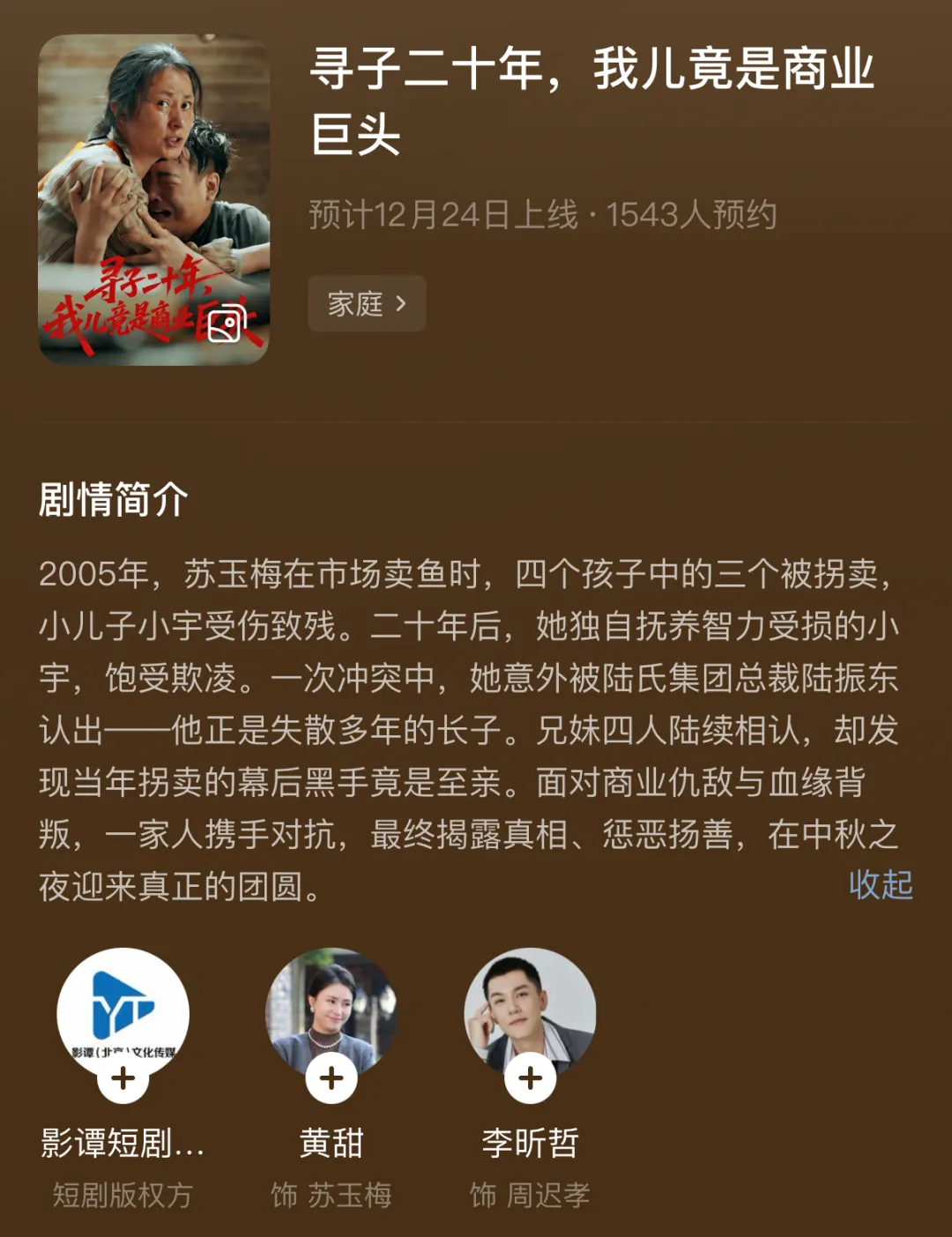 今冬,一部从现实议题出发,却最终指向温暖内核的短剧《寻子二十年,我儿竟是商业巨头》,将于12月24日在红果短剧平台正式上线。它不止步于对拐卖悲剧的呈现,更聚焦于伤痕的愈合与亲情的重塑,为岁末带来一股深沉而治愈的情感暖流。