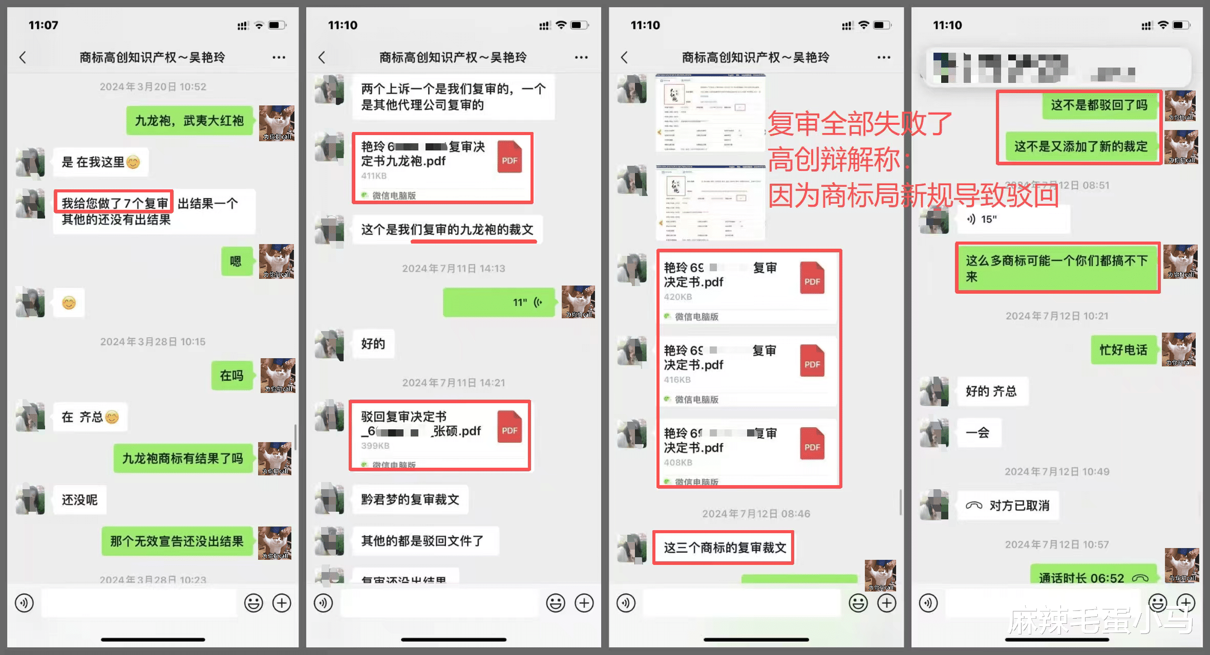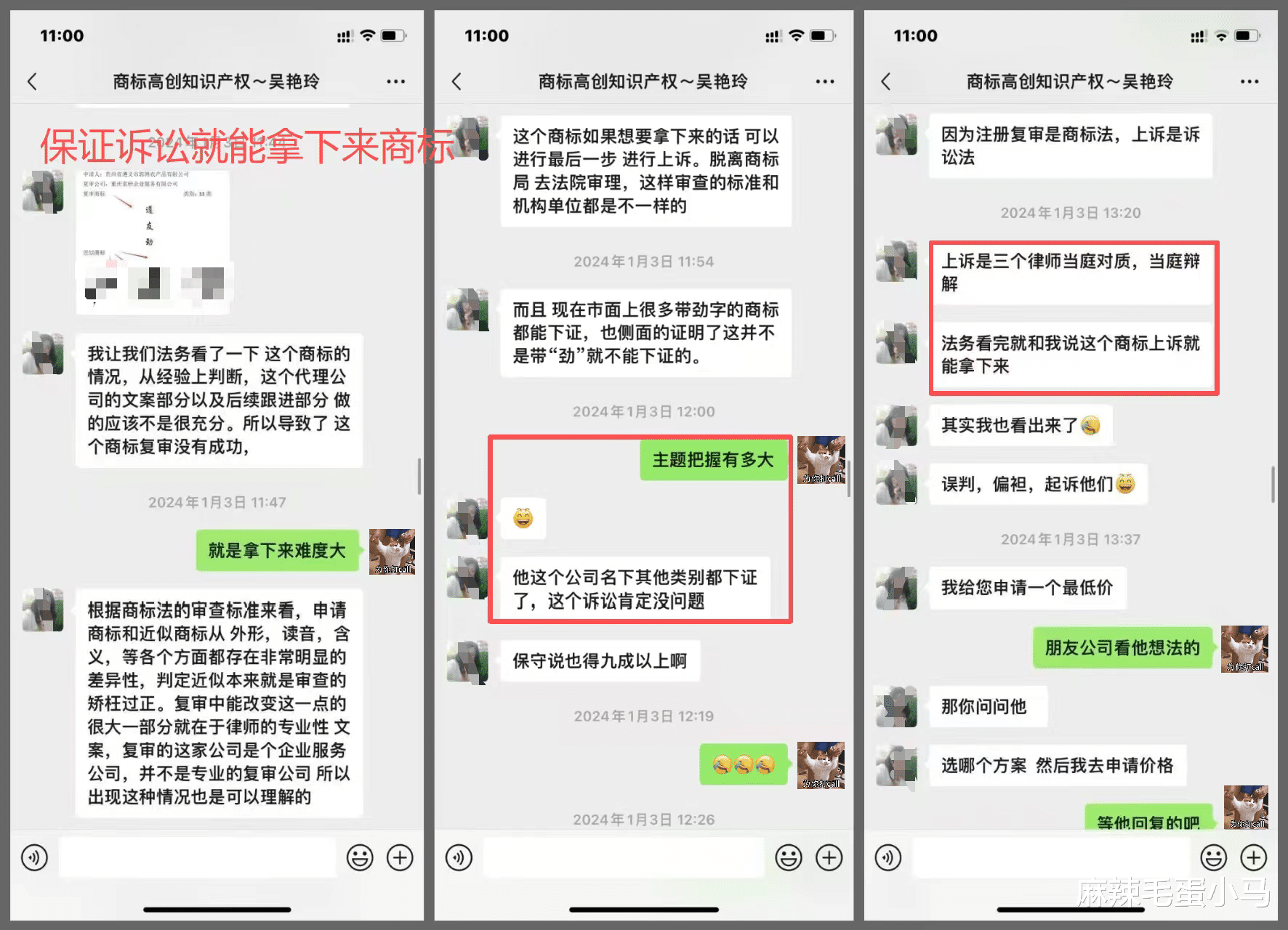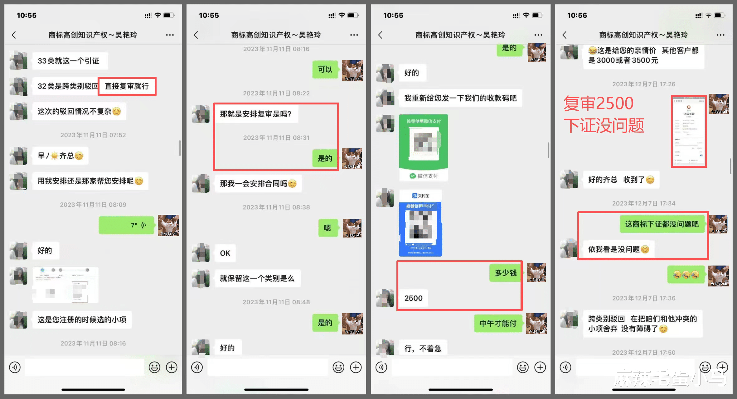 据齐先生提供的聊天记录显示,他因商标申请被驳回,与“高创知识产权”的业务员吴某取得联系。在沟通中,对方多次使用确定性表述: