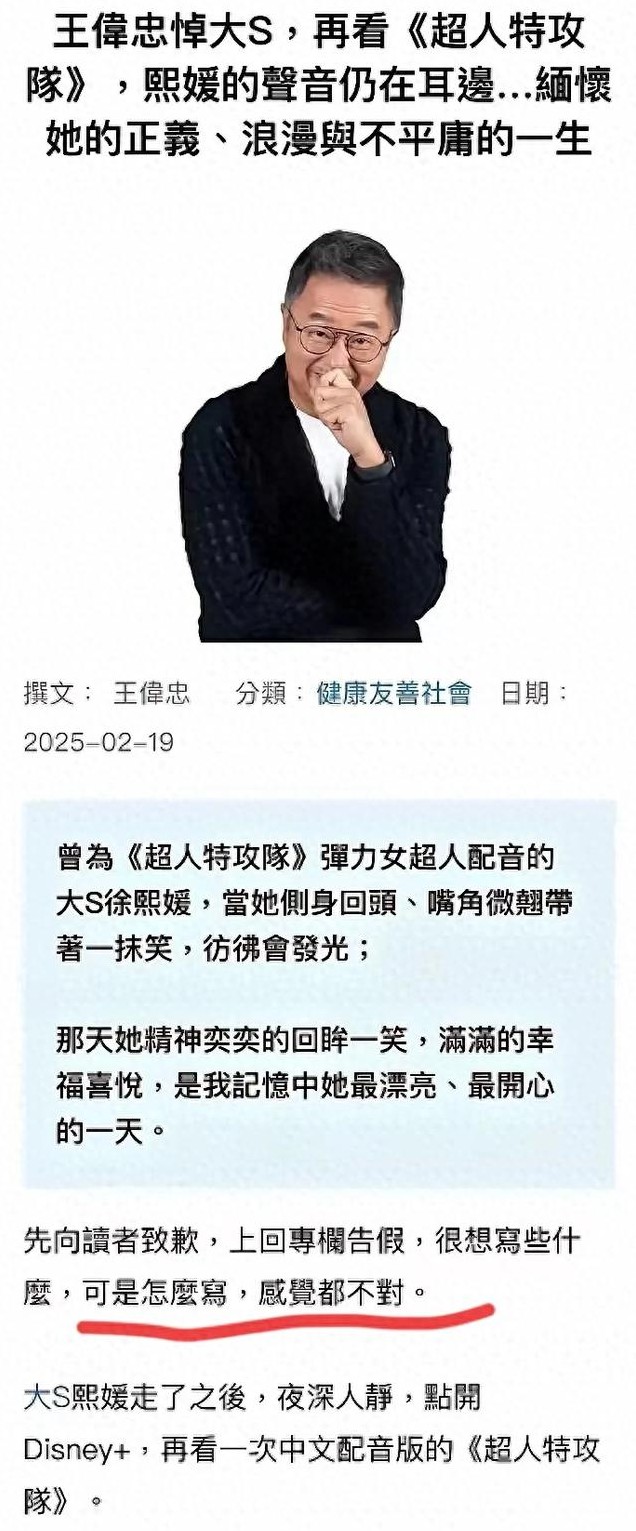 王伟忠致歉说:“一直想说些什么,但又不知道该说啥。因为怎么写,感觉都不对。这次再看大S配音的《超人特工队》,才开始写点什么。”