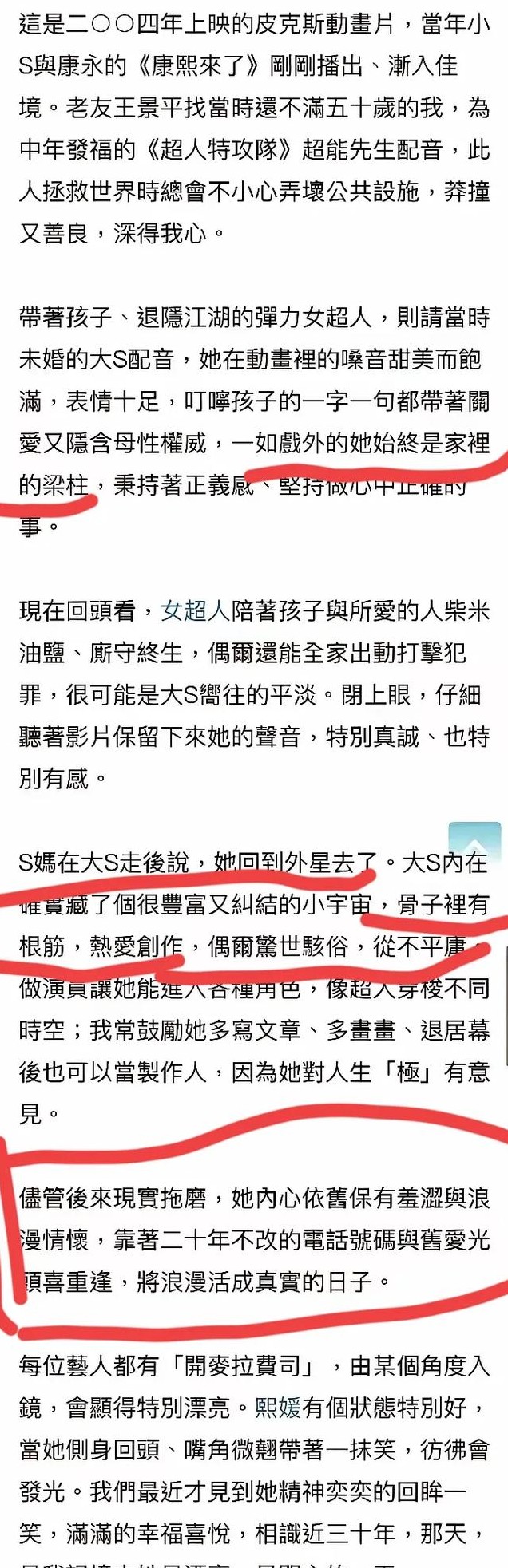 王伟忠说到:“大S走后,S妈说她到外星去了。大S内在确实藏着一个很丰富又很纠结的小宇宙,骨子里有根筋,热爱创作,偶尔惊世骇俗,从不平庸。