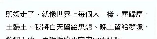 最后他说:“熙媛走了,就像世界上每个人一样,尘归尘,土归土。我将白天留给思想,晚上留给梦境,欢迎入梦,再说说你小宇宙中的狂想”。