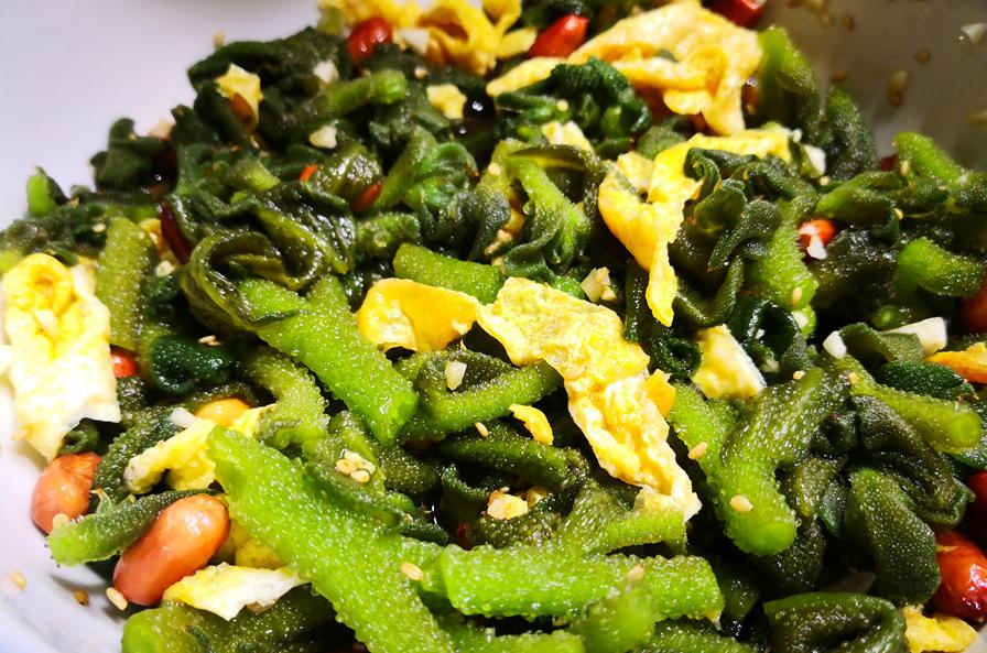 最后一步,把鸡蛋条、花生米和冰草放在一起,再加点拍扁剁细的蒜末,再来一勺熟芝麻,适量的味极鲜、米醋、白糖、盐和香油,搅拌均匀就可以了。