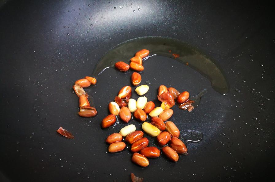 把花生米用凉油小火慢炒,直到表皮爆裂,发出“噼里啪啦”的声音,盛出晾凉备用。
